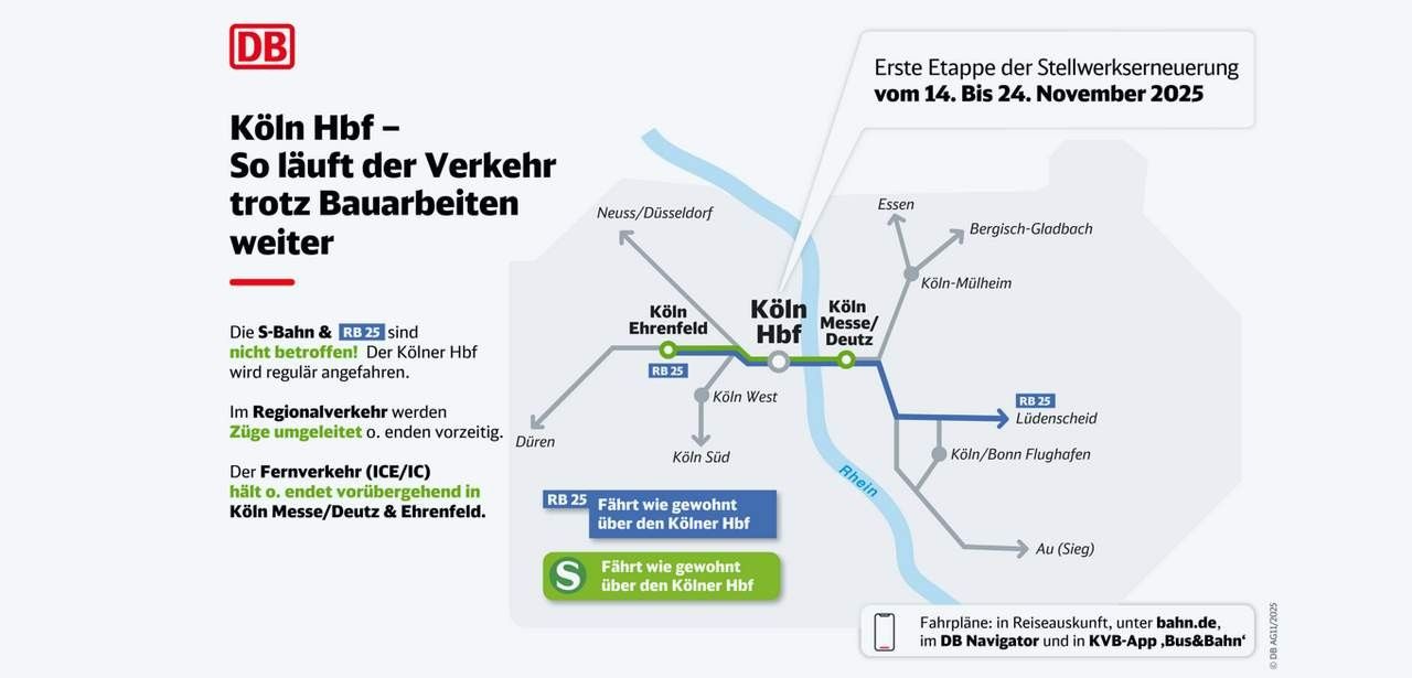 Während der koordinierte Sperrzeitraum am Kölner Hauptbahnhof greift ebenso wenig in den S-Bahn-Verkehr wie in den Betrieb der Regionalbahn RB25 ein. Diese Verbindungen verkehren durchgehend nach regulärem Takt und bedienen weiterhin ihre gewohnten Halte. Regional- und Fernverkehrszüge werden hingegen umgeleitet oder enden jeweils vorzeitig in Köln Messe/Deutz und Ehrenfeld. Alle relevanten Informationen stehen in der DB Navigator-App, auf bahn.de und in der KVB-App Bus&Bahn zur Verfügung. Bitte Fahrgäste informieren sich.